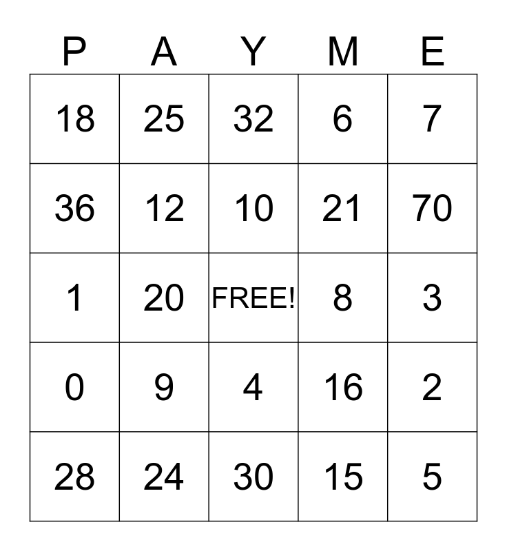 This bingo card has a free space and 24 words: 9, 24, 10, 28, 7, 18, 36, 25, 8, 4, 21, 1, 16, 2, 12, 15, 3, 32, 70, 20, 5, 0, 6 and 30.