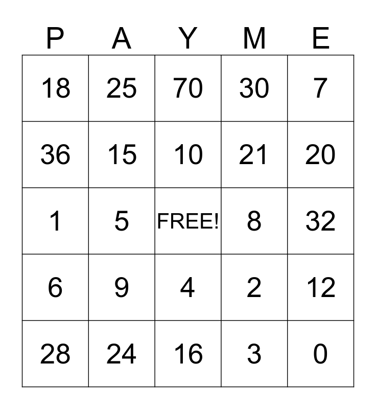 This bingo card has a free space and 24 words: 9, 24, 10, 28, 7, 18, 36, 25, 8, 4, 21, 1, 2, 12, 15, 3, 32, 70, 20, 5, 0, 6, 30 and 16.