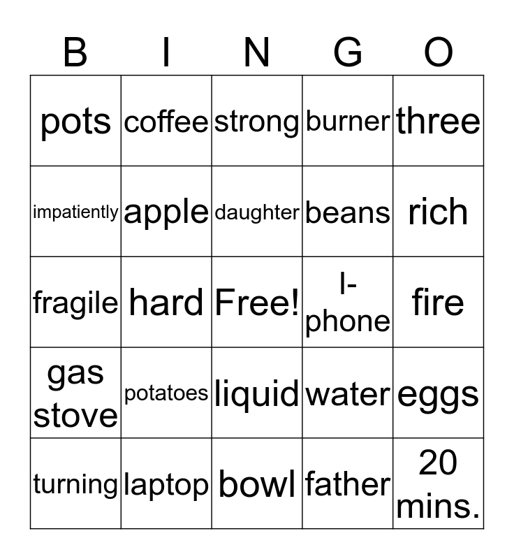 This bingo card has a free space and 24 words: potatoes, laptop, daughter, turning, three, pots, impatiently, coffee, I-phone, liquid, beans, fragile, water, eggs, apple, father, fire, strong, rich, hard, 20 mins., gas stove, burner and bowl.
