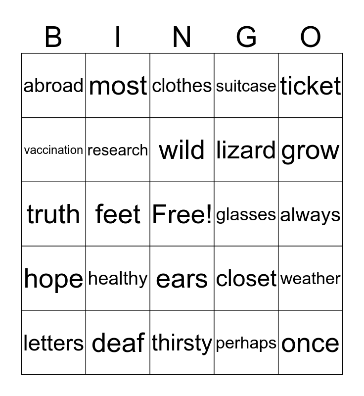 This bingo card has a free space and 34 words: hobby, perhaps, held, article, hope, research, ticket, letters, most, suit, wild, clothes, write, learn, glasses, grow, deaf, truth, healthy, closet, ears, soft, abroad, always, thirsty, once, suitcase, emergency, lizard, vaccination, couple, feet, weather and wearing.