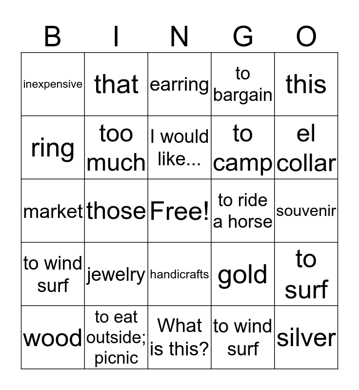 This bingo card has a free space and 24 words: jewelry, to eat outside; picnic, I would like..., wood, this, inexpensive, ring, that, to ride a horse, handicrafts, to camp, market, gold, to surf, too much, to wind surf, souvenir, earring, el collar, those, silver, to wind surf, to bargain and What is this?.