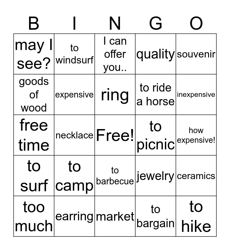 This bingo card has a free space and 24 words: to camp, earring, ring, too much, souvenir, may I see?, goods of wood, to windsurf, to picnic, to barbecue, to ride a horse, free time, jewelry, ceramics, expensive, to bargain, how expensive!, I can offer you.., inexpensive, necklace, to hike, to surf, quality and market.