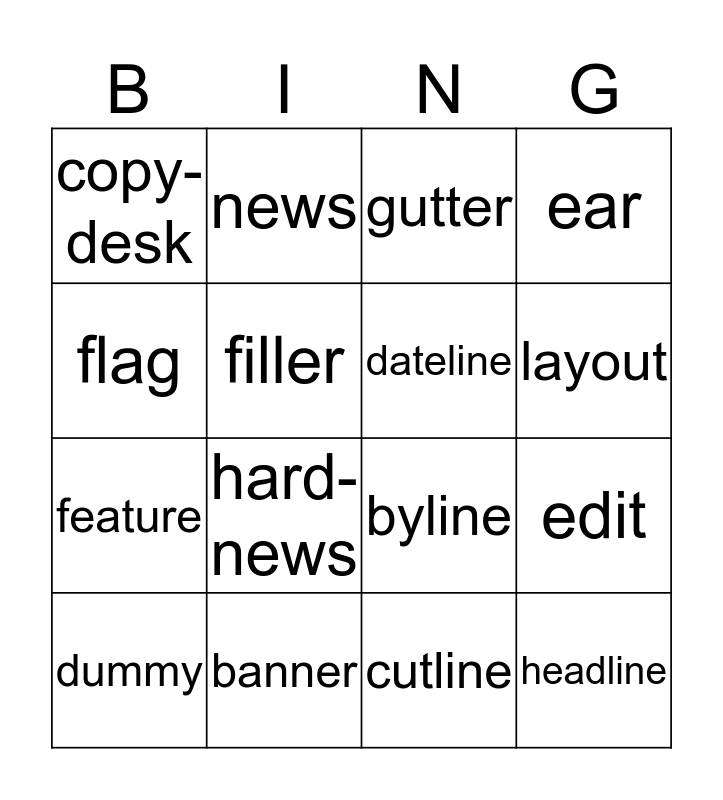 This bingo card has 32 words: Free!, jump, edit, editor, headline, dateline, flag, index, news, proof, layout, gutter, reporter, scoop, banner, boldface, break, byline, copy, cover, crop, cut, cutline, deadline, dummy, ear, feature, filler, copy-desk, columnist, wire-service and hard-news.