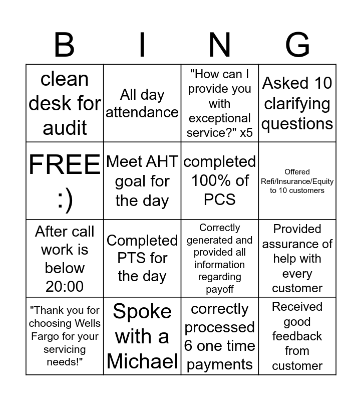 This bingo card has 16 words: Spoke with a Michael, Provided assurance of help with every customer, "How can I provide you with exceptional service?" x5, clean desk for audit, After call work is below 20:00, All day attendance, Correctly generated and provided all information regarding payoff, correctly processed 6 one time payments, FREE :), Meet AHT goal for the day, "Thank you for choosing Wells Fargo for your servicing needs!", Asked 10 clarifying questions, Completed PTS for the day, Offered Refi/Insurance/Equity to 10 customers, completed 100% of PCS and Received good feedback from customer.