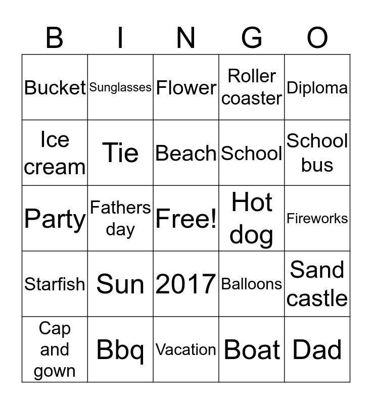 This bingo card has a free space and 24 words: Sun, Bbq, Beach, Cap and gown, Diploma, Bucket, Ice cream, Sunglasses, Hot dog, 2017, School, Party, Balloons, Sand castle, Tie, Boat, Fireworks, Flower, School bus, Fathers day, Dad, Starfish, Roller coaster and Vacation.