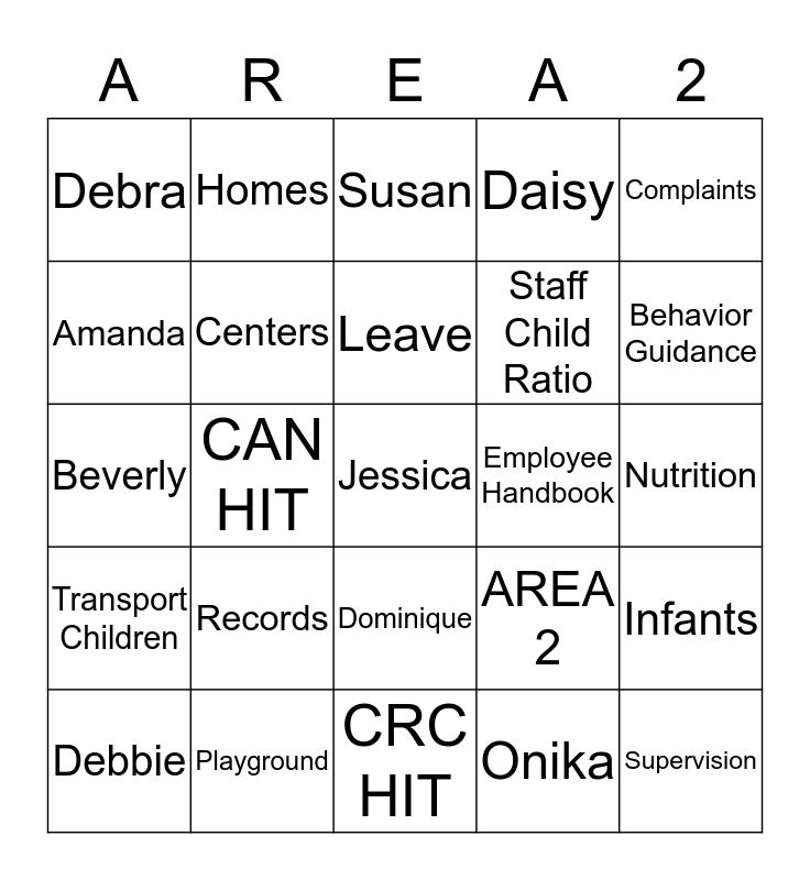 This bingo card has 25 words: Records, CRC HIT, Leave, Debbie, Complaints, Debra, Amanda, Homes, Employee Handbook, Dominique, Staff Child Ratio, Beverly, AREA 2, Infants, Centers, Supervision, Nutrition, Susan, Behavior Guidance, CAN HIT, Jessica, Playground, Transport Children, Daisy and Onika.