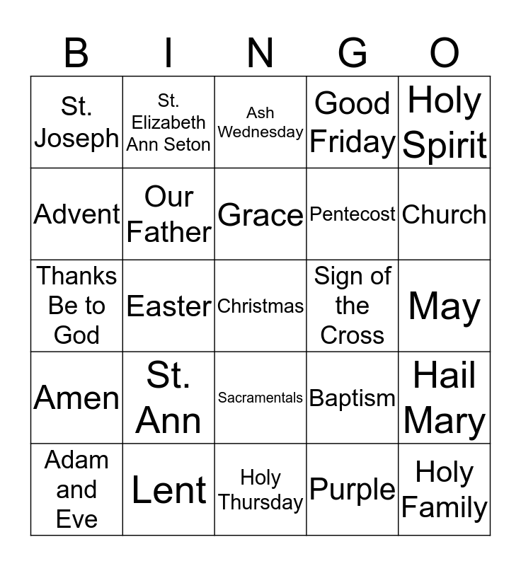 This bingo card has a free space and 24 words: St. Ann, Lent, Grace, Adam and Eve, Holy Spirit, St. Joseph, Advent, St. Elizabeth Ann Seton, Sign of the Cross, Sacramentals, Pentecost, Thanks Be to God, Baptism, Hail Mary, Our Father, Purple, May, Ash Wednesday, Church, Easter, Holy Family, Amen, Good Friday and Holy Thursday.