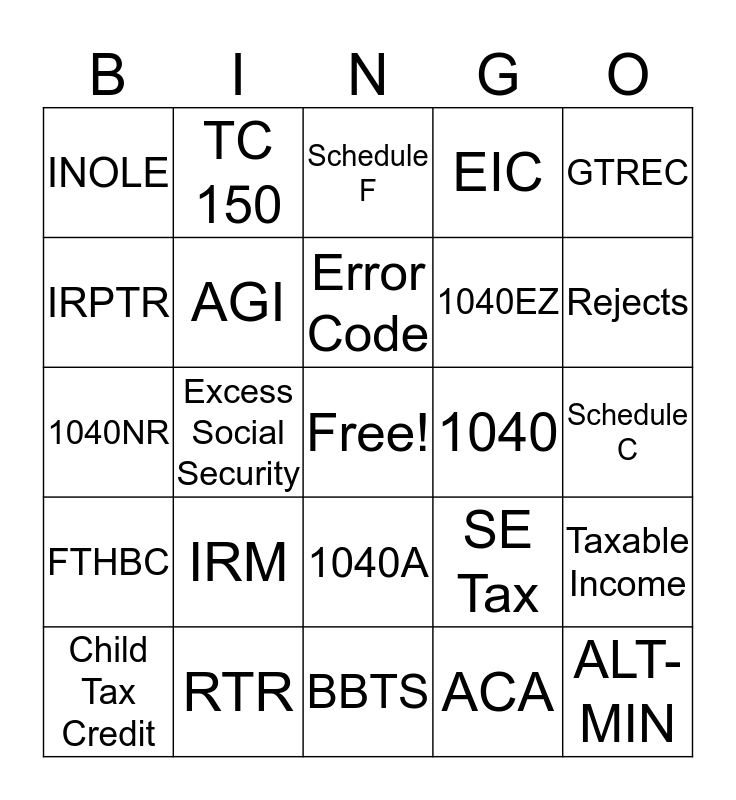 This bingo card has a free space and 25 words: IRM, BBTS, Error Code, Child Tax Credit, GTREC, INOLE, IRPTR, TC 150, 1040, 1040A, 1040EZ, 1040NR, SE Tax, Taxable Income, AGI, Schedule A, Schedule C, Schedule F, Rejects, Excess Social Security, ALT-MIN, RTR, FTHBC, EIC and ACA.