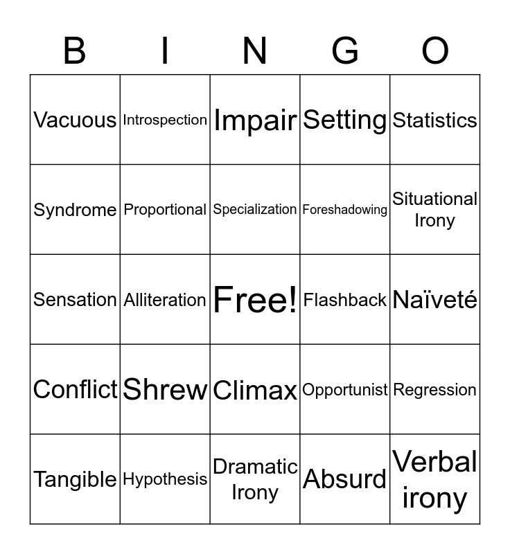 This bingo card has a free space and 24 words: Shrew, Hypothesis, Specialization, Tangible, Statistics, Vacuous, Syndrome, Introspection, Flashback, Climax, Foreshadowing, Sensation, Opportunist, Regression, Proportional, Absurd, Naïveté, Impair, Situational Irony, Alliteration, Verbal irony, Conflict, Setting and Dramatic Irony.