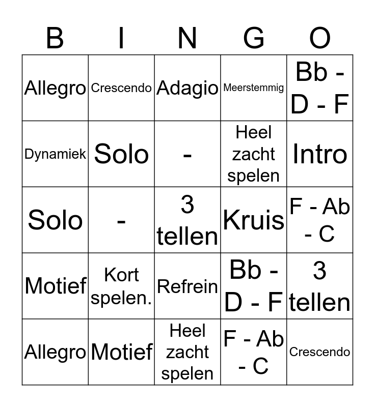 ⚠ This card has duplicate items: Intro (2), Crescendo (2), Allegro (2), Het stuk tussen de tekens herhalen. (2), F - Ab - C (2), Adagio (2), Tweeledig (2), Bb - D - F (2), Motief (2), Meerstemmig (2), Kruis (2), Refrein (2), Dynamiek (2), Heel zacht spelen (2), Solo (2), Dwarsfluit (2), - (5)