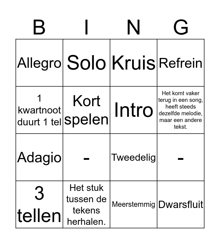 This bingo card has 25 words: Crescendo, Dynamiek, Het komt vaker terug in een song, heeft steeds dezelfde melodie, maar een andere tekst., -, 1 kwartnoot duurt 1 tel, Allegro, Kort spelen, Solo, Het stuk tussen de tekens herhalen., F - Ab - C, Adagio, Tweedelig, Bb - D - F, Motief, Intro, Heel zacht spelen, Meerstemmig, Kruis, -, -, 3 tellen, -, Dwarsfluit, Refrein and -.