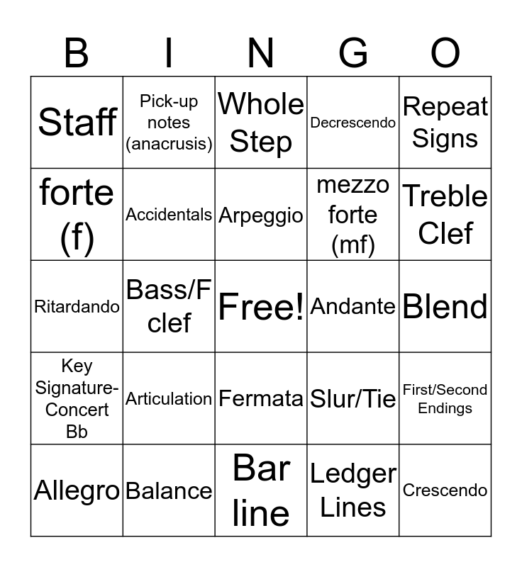 This bingo card has a free space and 32 words: Ledger Lines, Treble/G clef, Bass/F clef, Time Signature (4/4, 3/4, 2/4), Key Signature-Concert Bb, Accidentals, Repeat Signs, First/Second Endings, Pick-up notes (anacrusis), Scale, Arpeggio, Whole Step, Half Step, Tempo, Andante, Moderato, Allegro, Ritardando, Fermata, Articulation, Slur/Tie, Accents (regular), Blend, Balance, Crescendo, Decrescendo, mezzo forte (mf), forte (f), Staff, Bar line, Measure and Treble Clef.