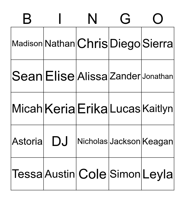 This bingo card has 25 words: DJ, Cole, Alissa, Tessa, Sierra, Madison, Sean, Nathan, Lucas, Nicholas, Zander, Micah, Jackson, Keagan, Elise, Leyla, Kaitlyn, Chris, Jonathan, Keria, Erika, Austin, Astoria, Diego and Simon.