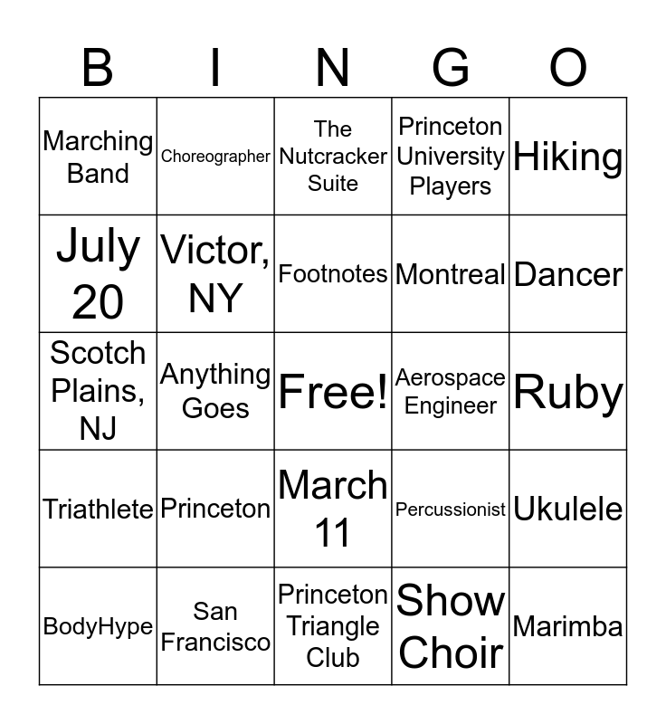 This bingo card has a free space and 24 words: Princeton, San Francisco, Footnotes, BodyHype, Hiking, Marching Band, July 20, Choreographer, Aerospace Engineer, March 11, Montreal, Scotch Plains, NJ, Percussionist, Ukulele, Victor, NY, Show Choir, Ruby, The Nutcracker Suite, Dancer, Anything Goes, Marimba, Triathlete, Princeton University Players and Princeton Triangle Club.