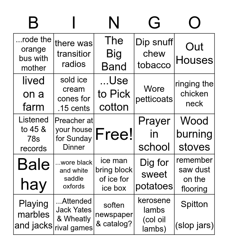 This bingo card has a free space and 24 words: ...wore black and white saddle oxfords, ...Attended Jack Yates & Wheatly rival games, ...Use to Pick cotton, Playing marbles and jacks, Out Houses, ...rode the orange bus with mother, lived on a farm, there was transitior radios, Prayer in school, ice man bring block of ice for ice box, Wore petticoats, Listened to 45 & 78s records, Dig for sweet potatoes, remember saw dust on the flooring, sold ice cream cones for .15 cents, kerosene lambs (col oil lambs), Wood burning stoves, The Big Band, ringing the chicken neck, Preacher at your house for Sunday Dinner, Spitton (slop jars), Bale hay, Dip snuff chew tobacco and soften newspaper & catalog?.