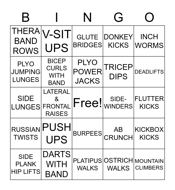 This bingo card has a free space and 24 words: PUSH UPS, DARTS WITH BAND, PLYO POWER JACKS, SIDE PLANK HIP LIFTS, INCH WORMS, THERA BAND ROWS, PLYO JUMPING LUNGES, V-SIT UPS, SIDE-WINDERS, BURPEES, TRICEP DIPS, SIDE LUNGES, AB CRUNCH, KICKBOX KICKS, BICEP CURLS WITH BAND, OSTRICH WALKS, FLUTTER KICKS, GLUTE BRIDGES, DEADLIFTS, LATERAL & FRONTAL RAISES, MOUNTAIN CLIMBERS, RUSSIAN TWISTS, DONKEY KICKS and PLATIPUS WALKS.