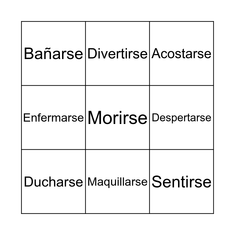 This bingo card has 20 words: Lavarse, Acordarse, Acostarse, Dormirse, Irse, Morirse, Ponerse, Bañarse, Sentirse, Divertirse, Vestirse, Afeitarse, Despertarse, Cepillarse, Ducharse, Levantarse, Maquillarse, Enfermarse, Enojarse and Alegrarse.