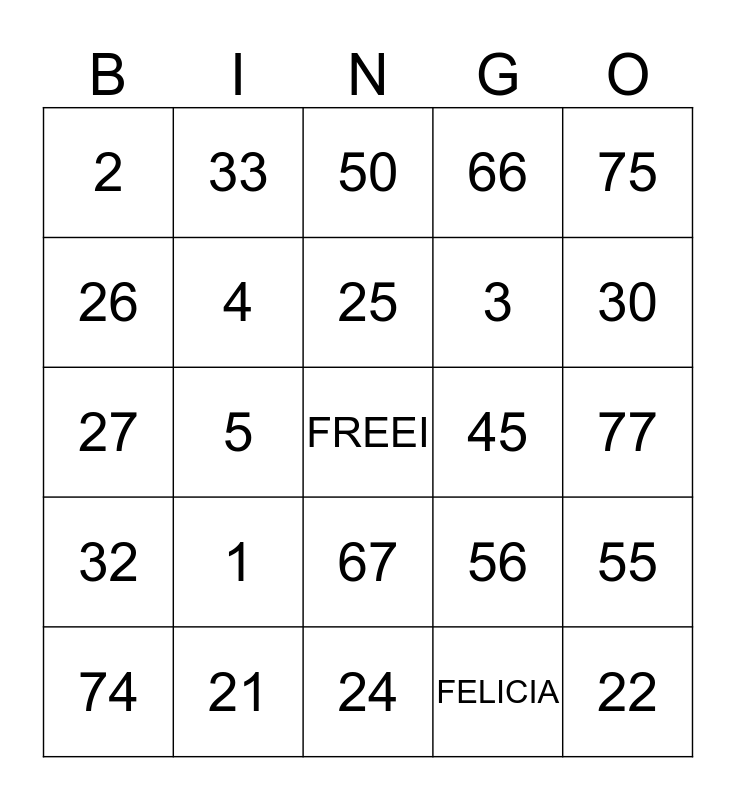 This bingo card has a free space and 25 words: 1, 24, 25, 74, 75, 2, 26, 33, 45, 67, 3, 27, 56, 55, 4, 54, 77, 50, 30, 5, 22, 21, 32, 66 and FELICIA.