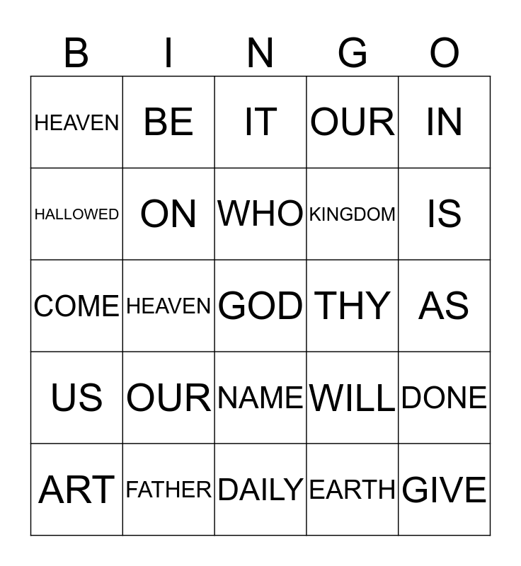 This bingo card has a free space and 24 words: OUR, FATHER, WHO, ART, IN, HEAVEN, HALLOWED, BE, THY, NAME, KINGDOM, COME, WILL, DONE, ON, EARTH, AS, IT, IS, HEAVEN, GIVE, US, OUR and DAILY.