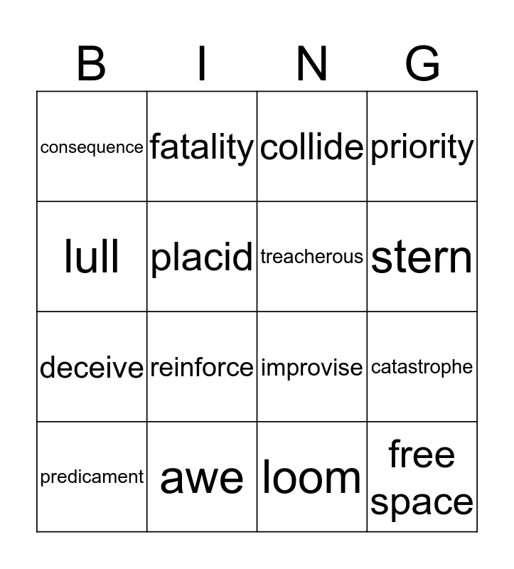 This bingo card has 16 words: awe, catastrophe, collide, consequence, deceive, fatality, improvise, loom, lull, placid, predicament, priority, reinforce, stern, treacherous and free space.