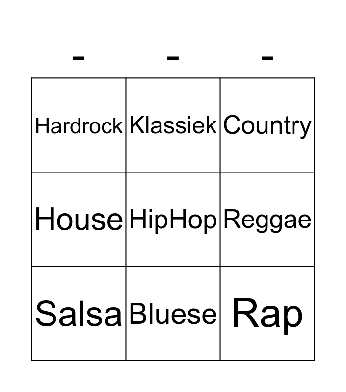 This bingo card has a free space and 8 words: Reggae, Country, Klassiek, Salsa, Hardrock, Rap, House and Bluese.