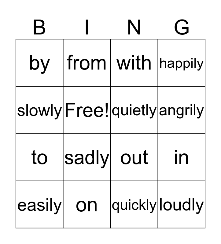 This bingo card has 16 words: on, in, with, by, to, from, out, quickly, slowly, Free!, easily, happily, sadly, angrily, quietly and loudly.
