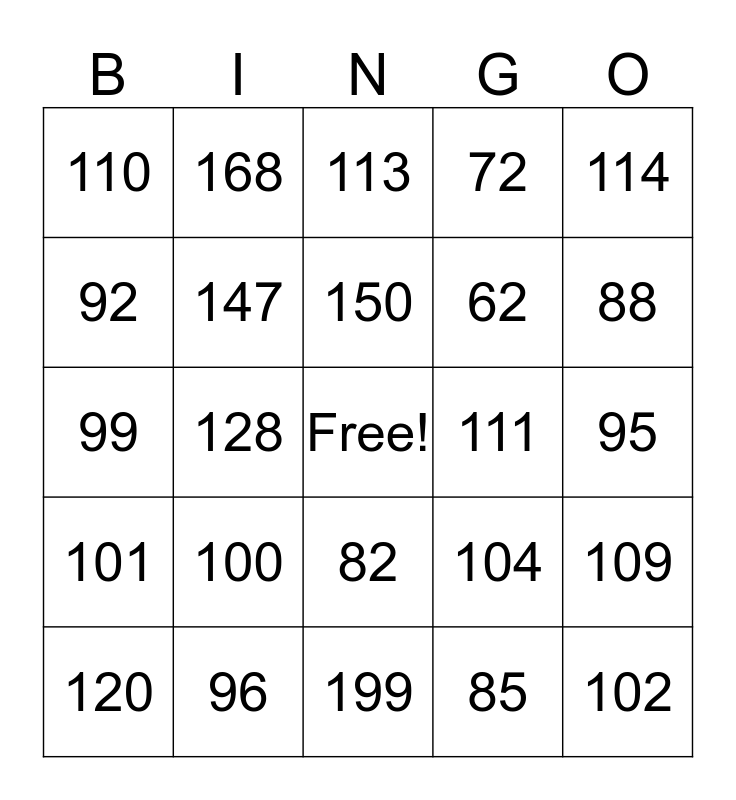This bingo card has a free space and 24 words: 100, 96, 150, 120, 114, 110, 92, 168, 111, 82, 62, 99, 104, 109, 147, 85, 95, 113, 88, 128, 102, 101, 72 and 199.