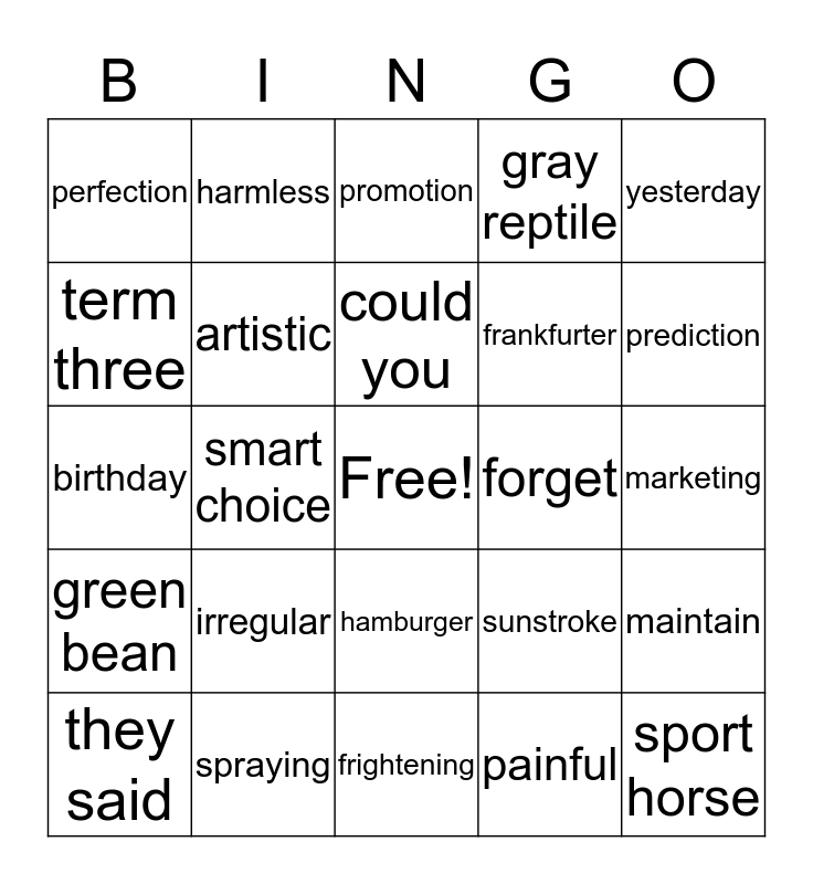 This bingo card has a free space and 24 words: irregular, spraying, could you, they said, yesterday, perfection, term three, harmless, forget, hamburger, frankfurter, birthday, sunstroke, maintain, artistic, painful, marketing, promotion, prediction, smart choice, sport horse, green bean, gray reptile and frightening.