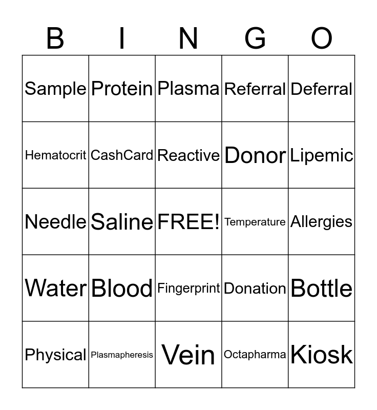 This bingo card has a free space and 24 words: Blood, Plasmapheresis, Reactive, Physical, Deferral, Sample, Hematocrit, Protein, Temperature, Fingerprint, Donor, Needle, Donation, Bottle, CashCard, Octapharma, Allergies, Plasma, Lipemic, Saline, Kiosk, Water, Referral and Vein.