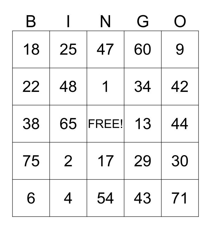 This bingo card has a free space and 24 words: 2, 4, 1, 6, 9, 18, 22, 25, 13, 17, 34, 38, 29, 30, 48, 43, 44, 47, 42, 65, 71, 75, 60 and 54.