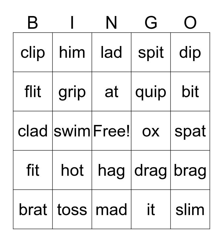 This bingo card has a free space and 24 words: hot, toss, at, brat, dip, clip, flit, him, ox, hag, quip, clad, drag, brag, grip, it, spat, lad, bit, swim, slim, fit, spit and mad.