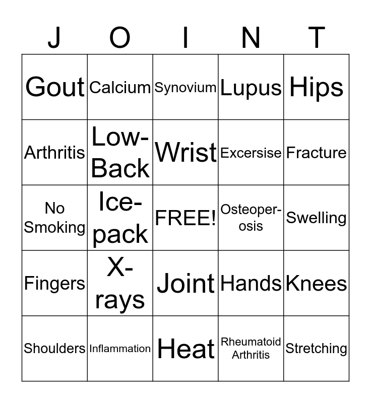 This bingo card has a free space and 24 words: X-rays, Inflammation, Wrist, Shoulders, Hips, Gout, Arthritis, Calcium, Osteoper-osis, Joint, Excersise, No Smoking, Hands, Knees, Low-Back, Rheumatoid Arthritis, Swelling, Synovium, Fracture, Ice-pack, Stretching, Fingers, Lupus and Heat.