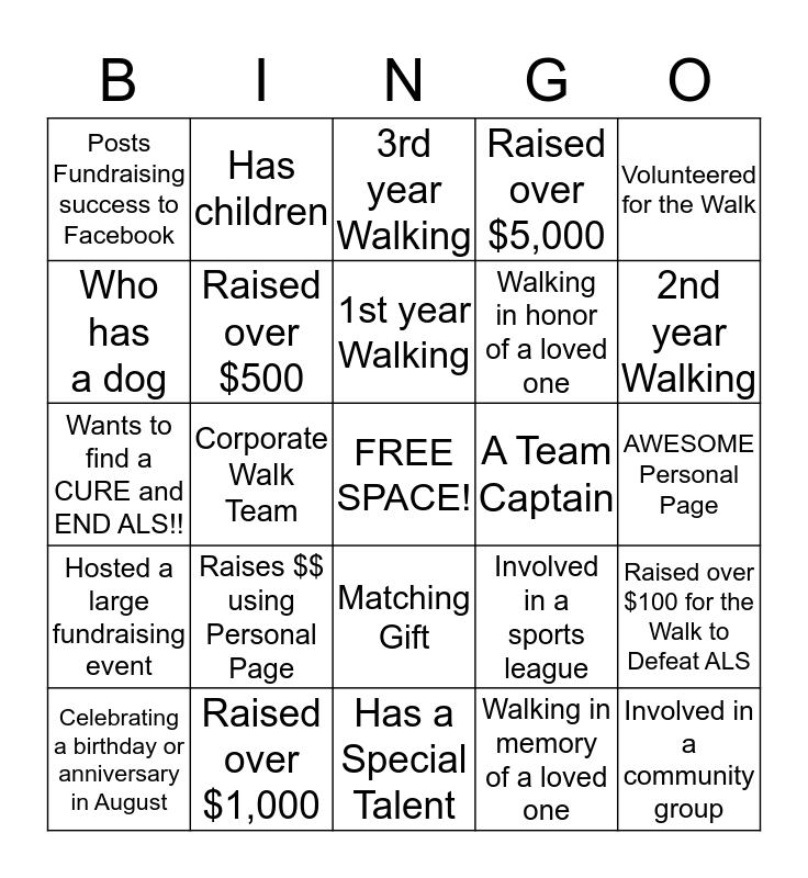 This bingo card has a free space and 24 words: Raises $$ using Personal Page, Raised over $1,000, 1st year Walking, Celebrating a birthday or anniversary in August, Volunteered for the Walk, Posts Fundraising success to Facebook, Who has a dog, Has children, A Team Captain, Matching Gift, Walking in honor of a loved one, Wants to find a CURE and END ALS!!, Involved in a sports league, Raised over $100 for the Walk to Defeat ALS, Raised over $500, Walking in memory of a loved one, AWESOME Personal Page, 3rd year Walking, 2nd year Walking, Corporate Walk Team, Involved in a community group, Hosted a large fundraising event, Raised over $5,000 and Has a Special Talent.