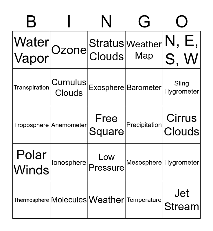This bingo card has a free space and 24 words: Ionosphere, Molecules, Exosphere, Thermosphere, N, E, S, W, Water Vapor, Transpiration, Ozone, Precipitation, Low Pressure, Barometer, Troposphere, Mesosphere, Hygrometer, Cumulus Clouds, Temperature, Cirrus Clouds, Stratus Clouds, Sling Hygrometer, Anemometer, Jet Stream, Polar Winds, Weather Map and Weather.