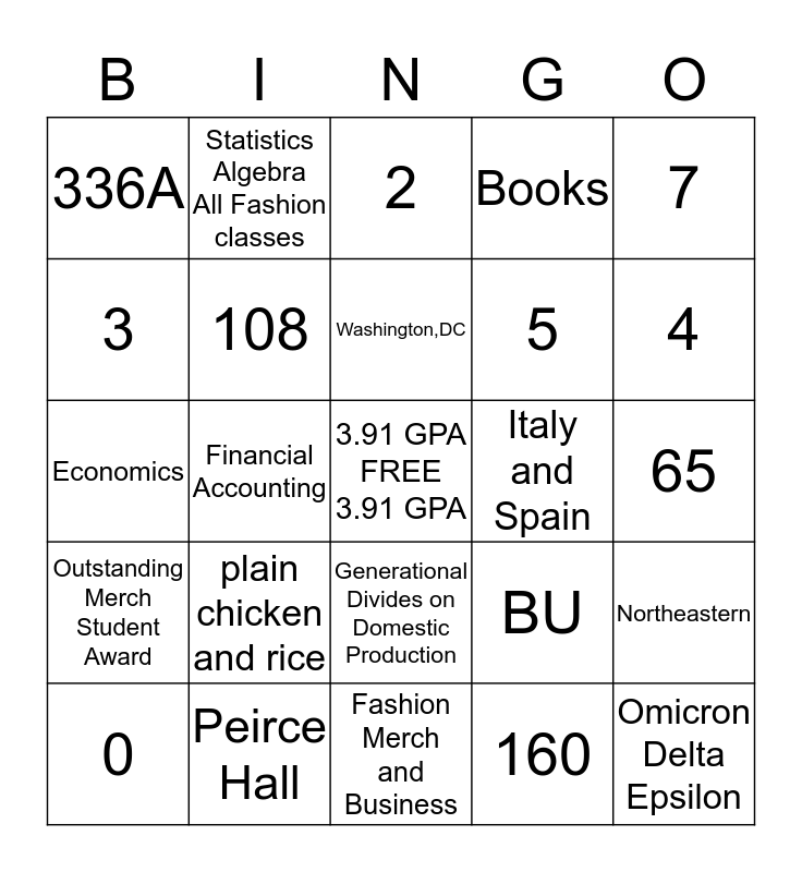 This bingo card has a free space and 24 words: plain chicken and rice, Peirce Hall, Washington,DC, 0, 7, 336A, 3, Statistics Algebra All Fashion classes, Italy and Spain, Generational Divides on Domestic Production, 5, Economics, BU, Northeastern, 108, 160, 65, 2, 4, Financial Accounting, Omicron Delta Epsilon, Outstanding Merch Student Award, Books and Fashion Merch and Business.