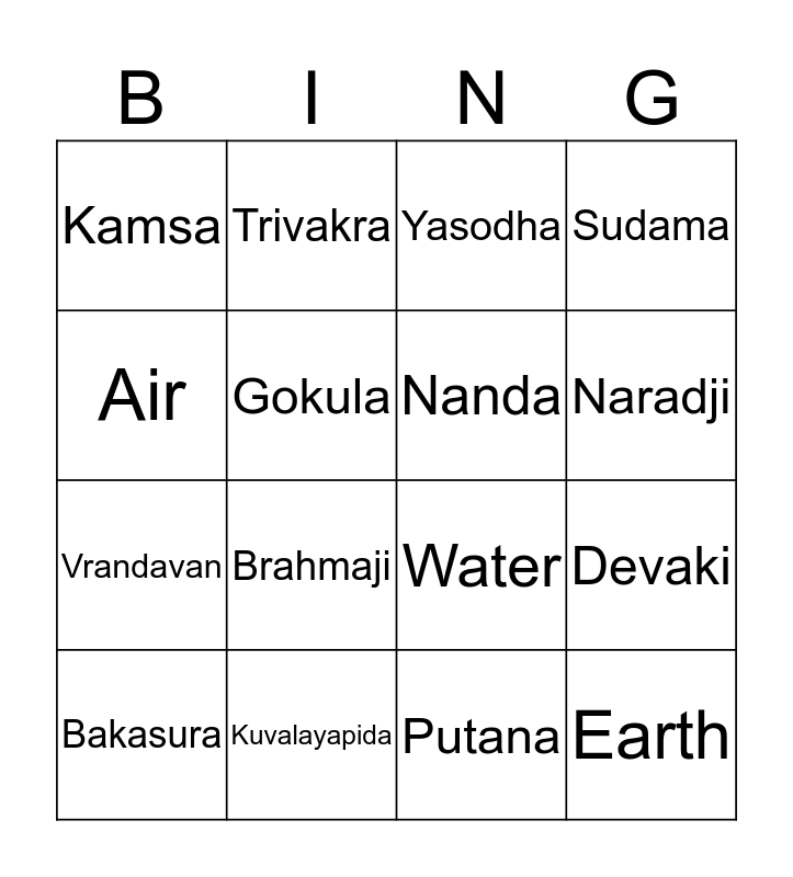 This bingo card has 29 words: Free!, Krishna, Devaki, Vasudeva, Kamsa, Yasodha, Nanda, Balarama, Kuvalayapida, Akrura, Putana, Bakasura, Agasura, Indira, Brahmaji, Govardhana, Kali, Earth, Air, Water, Space, Mathura, Vrandavan, Gokula, Sudama, Trivakra, Canura, Naradji and Varuna.