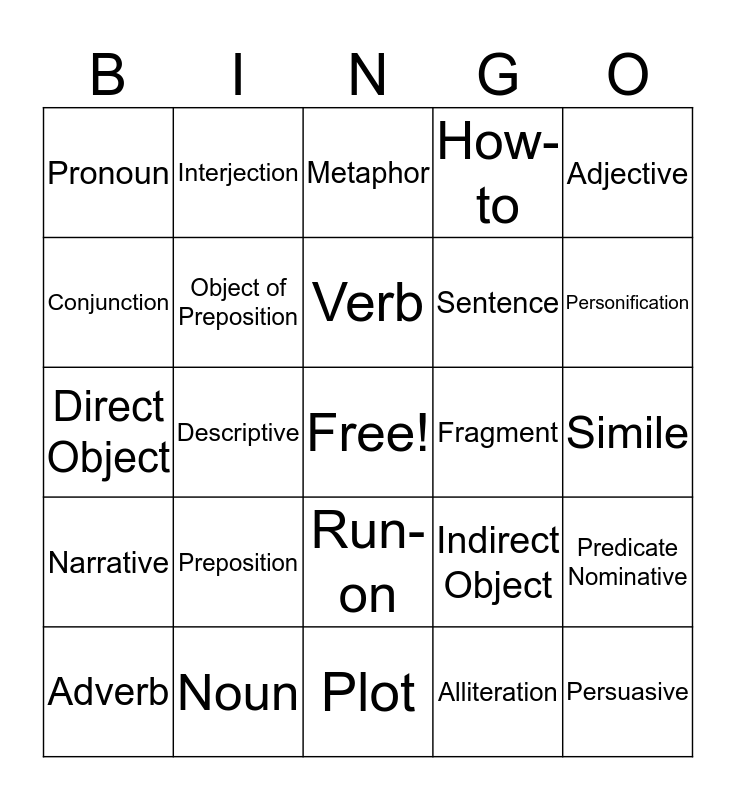 This bingo card has a free space and 24 words: Preposition, Noun, Verb, Adverb, Adjective, Pronoun, Conjunction, Interjection, Fragment, Run-on, Sentence, Direct Object, Indirect Object, Predicate Nominative, Object of Preposition, Alliteration, Simile, Metaphor, Personification, Descriptive, Persuasive, Narrative, How-to and Plot.