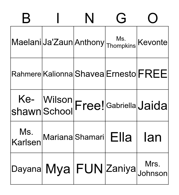 This bingo card has a free space and 24 words: Mariana, Mya, Shavea, Dayana, Kevonte, Maelani, Rahmere, Ja'Zaun, Gabriella, Shamari, Ernesto, Ke-shawn, Ella, Ian, Kalionna, Zaniya, Jaida, Anthony, FREE, Wilson School, Mrs. Johnson, Ms. Karlsen, Ms. Thompkins and FUN.
