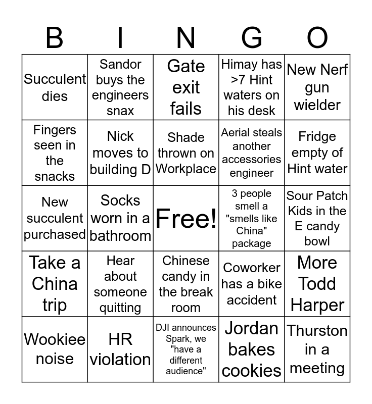 This bingo card has a free space and 24 words: Hear about someone quitting, HR violation, Shade thrown on Workplace, Wookiee noise, New Nerf gun wielder, Succulent dies, Fingers seen in the snacks, Sandor buys the engineers snax, 3 people smell a "smells like China" package, Chinese candy in the break room, Aerial steals another accessories engineer, New succulent purchased, Coworker has a bike accident, More Todd Harper, Nick moves to building D, Jordan bakes cookies, Sour Patch Kids in the E candy bowl, Gate exit fails, Fridge empty of Hint water, Socks worn in a bathroom, Thurston in a meeting, Take a China trip, Himay has >7 Hint waters on his desk and DJI announces Spark, we "have a different audience".