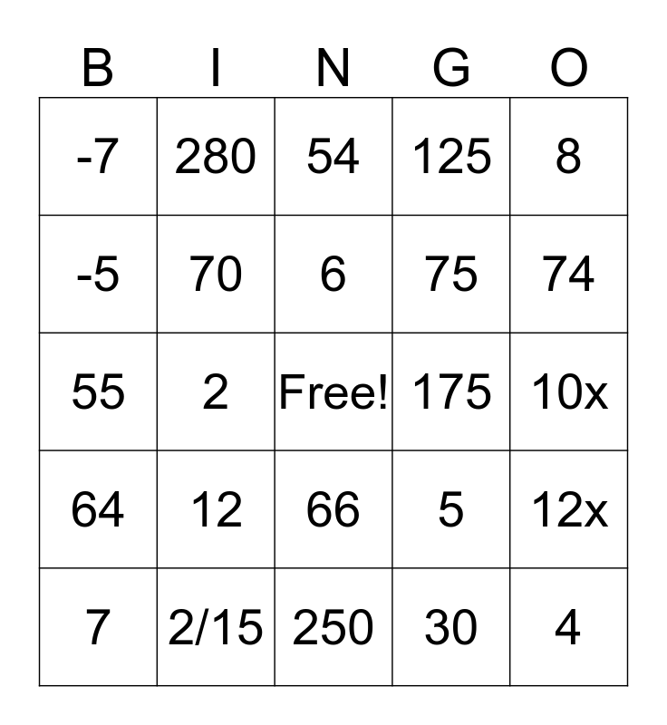 This bingo card has a free space and 24 words: 12, 2/15, 6, 7, 8, -7, -5, 280, 175, 66, 75, 55, 5, 12x, 70, 30, 10x, 54, 74, 2, 4, 64, 125 and 250.