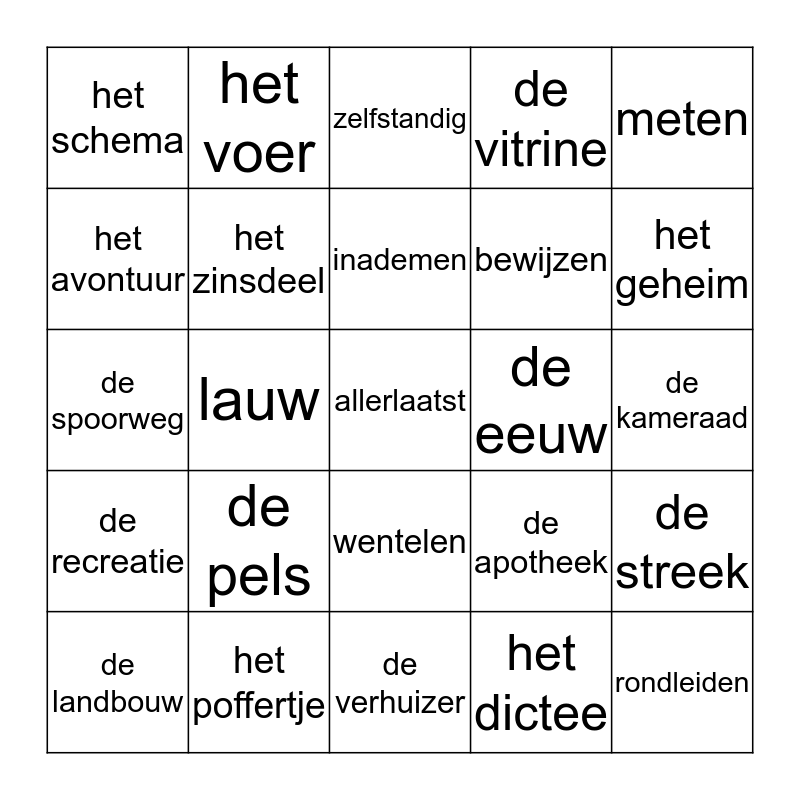 This bingo card has a free space and 24 words: de pels, het poffertje, inademen, de landbouw, meten, het schema, het avontuur, het voer, de eeuw, wentelen, bewijzen, de spoorweg, de apotheek, de streek, het zinsdeel, het dictee, de kameraad, zelfstandig, het geheim, lauw, rondleiden, de recreatie, de vitrine and de verhuizer.