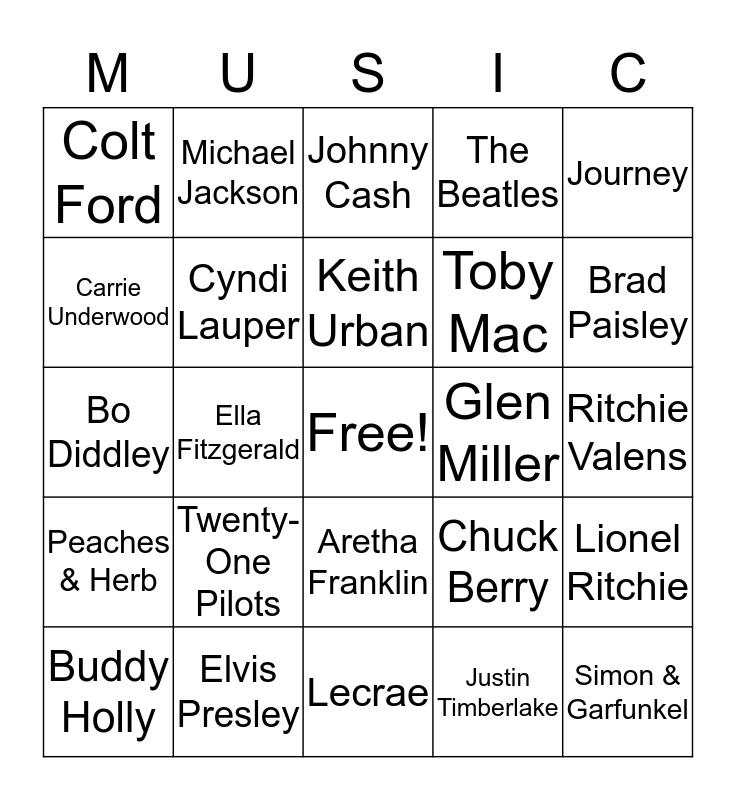 This bingo card has a free space and 24 words: Twenty-One Pilots, Elvis Presley, Keith Urban, Buddy Holly, Journey, Colt Ford, Carrie Underwood, Michael Jackson, Glen Miller, Aretha Franklin, Toby Mac, Bo Diddley, Chuck Berry, Lionel Ritchie, Cyndi Lauper, Justin Timberlake, Ritchie Valens, Johnny Cash, Brad Paisley, Ella Fitzgerald, Simon & Garfunkel, Peaches & Herb, The Beatles and Lecrae.