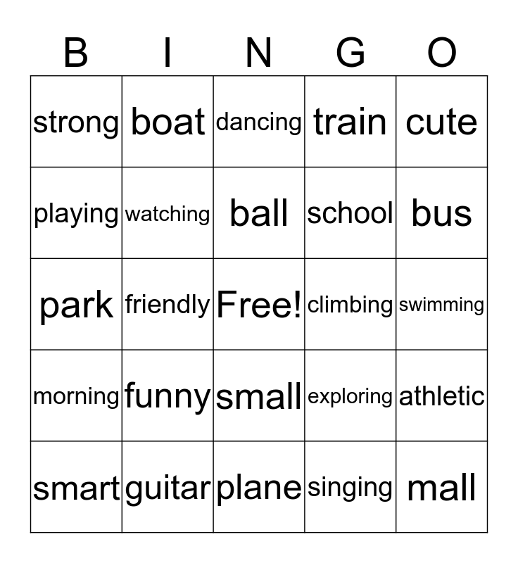 This bingo card has a free space and 24 words: funny, guitar, ball, smart, cute, strong, playing, boat, climbing, small, school, park, exploring, athletic, watching, singing, swimming, dancing, bus, friendly, mall, morning, train and plane.