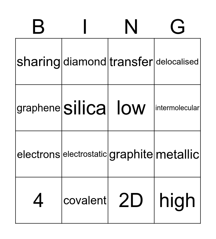 This bingo card has 16 words: covalent, metallic, transfer, sharing, electrons, diamond, graphite, 2D, graphene, silica, 4, delocalised, electrostatic, intermolecular, low and high.