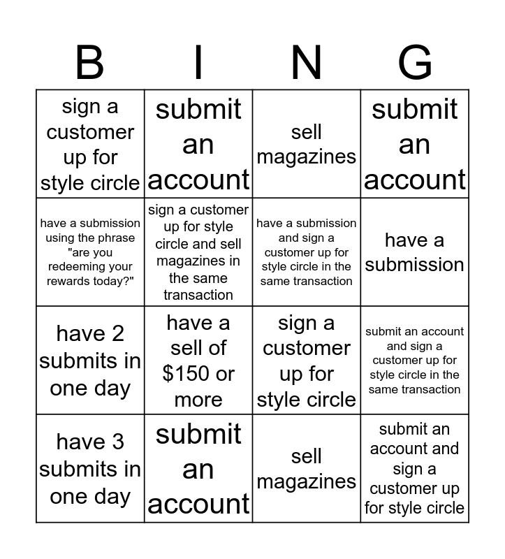 This bingo card has 16 words: submit an account, submit an account and sign a customer up for style circle in the same transaction, sell magazines, sign a customer up for style circle, have 2 submits in one day, submit an account, sign a customer up for style circle, sell magazines, have a submission using the phrase "are you redeeming your rewards today?", sign a customer up for style circle and sell magazines in the same transaction, have 3 submits in one day, submit an account, have a sell of $150 or more, have a submission, have a submission and sign a customer up for style circle in the same transaction and submit an account and sign a customer up for style circle.