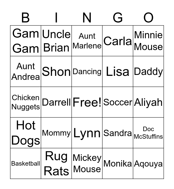 This bingo card has a free space and 24 words: Mommy, Rug Rats, Dancing, Basketball, Minnie Mouse, Gam Gam, Aunt Andrea, Uncle Brian, Soccer, Lynn, Lisa, Chicken Nuggets, Sandra, Doc McStuffins, Shon, Monika, Aliyah, Aunt Marlene, Daddy, Darrell, Aqouya, Hot Dogs, Carla and Mickey Mouse.