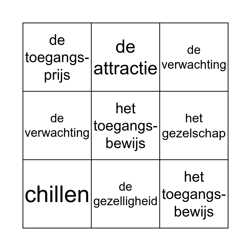This bingo card has 15 words: actief, verzamelen, de verwachting, de toegangs- prijs, de gezelligheid, het toegangs-bewijs, de vrije tijd, sluiten, het gezelschap, het toegangs-bewijs, de toegangs- prijs, de verwachting, chillen, de attractie and zich amuseren.