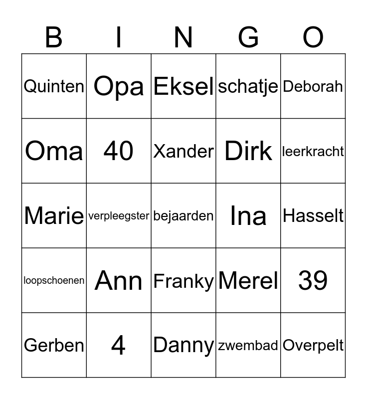 This bingo card has 25 words: Ann, Danny, Xander, Gerben, Deborah, Quinten, Oma, Opa, Ina, Franky, Dirk, Marie, Merel, 39, 40, Overpelt, Hasselt, Eksel, leerkracht, verpleegster, bejaarden, 4, loopschoenen, schatje and zwembad.