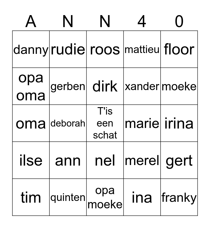 This bingo card has a free space and 24 words: ann, quinten, dirk, tim, floor, danny, opa oma, rudie, marie, nel, xander, oma, merel, gert, gerben, ina, irina, roos, moeke, deborah, franky, ilse, mattieu and opa moeke.