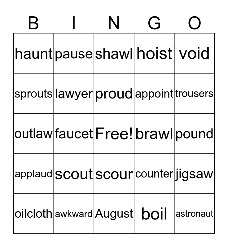 This bingo card has a free space and 24 words: scout, awkward, proud, oilcloth, void, haunt, sprouts, pause, brawl, scour, appoint, outlaw, counter, jigsaw, lawyer, boil, pound, shawl, trousers, faucet, astronaut, applaud, hoist and August.